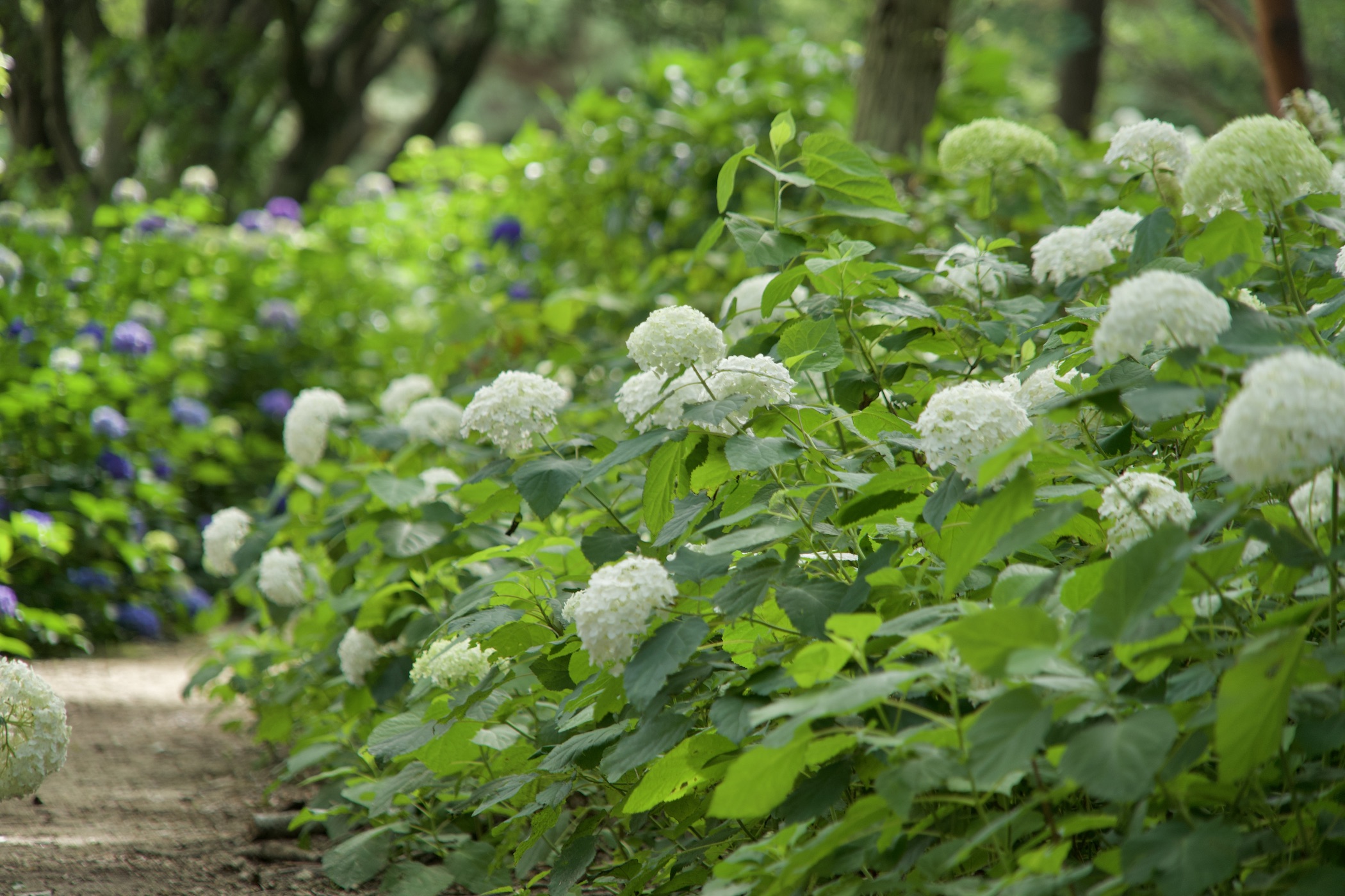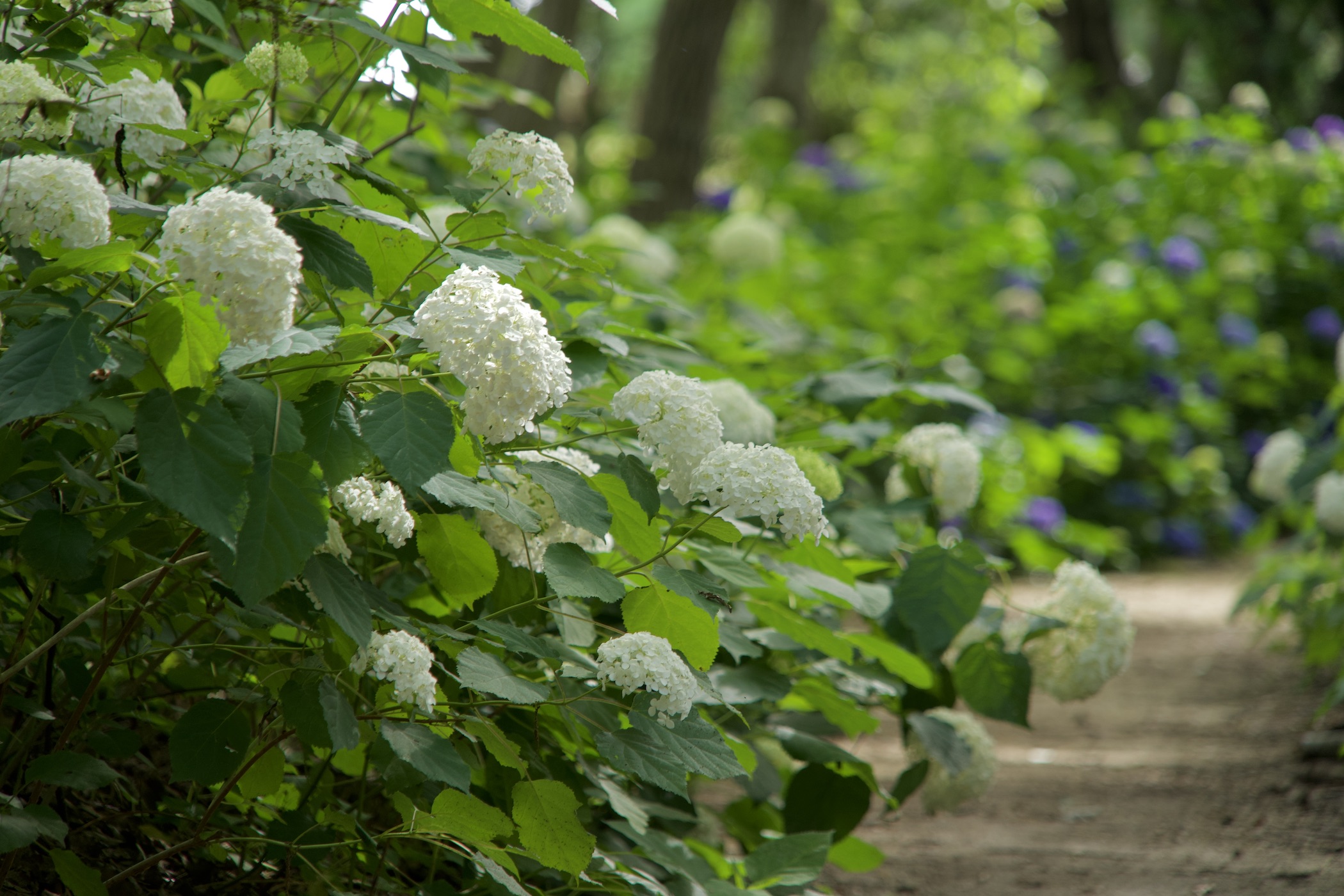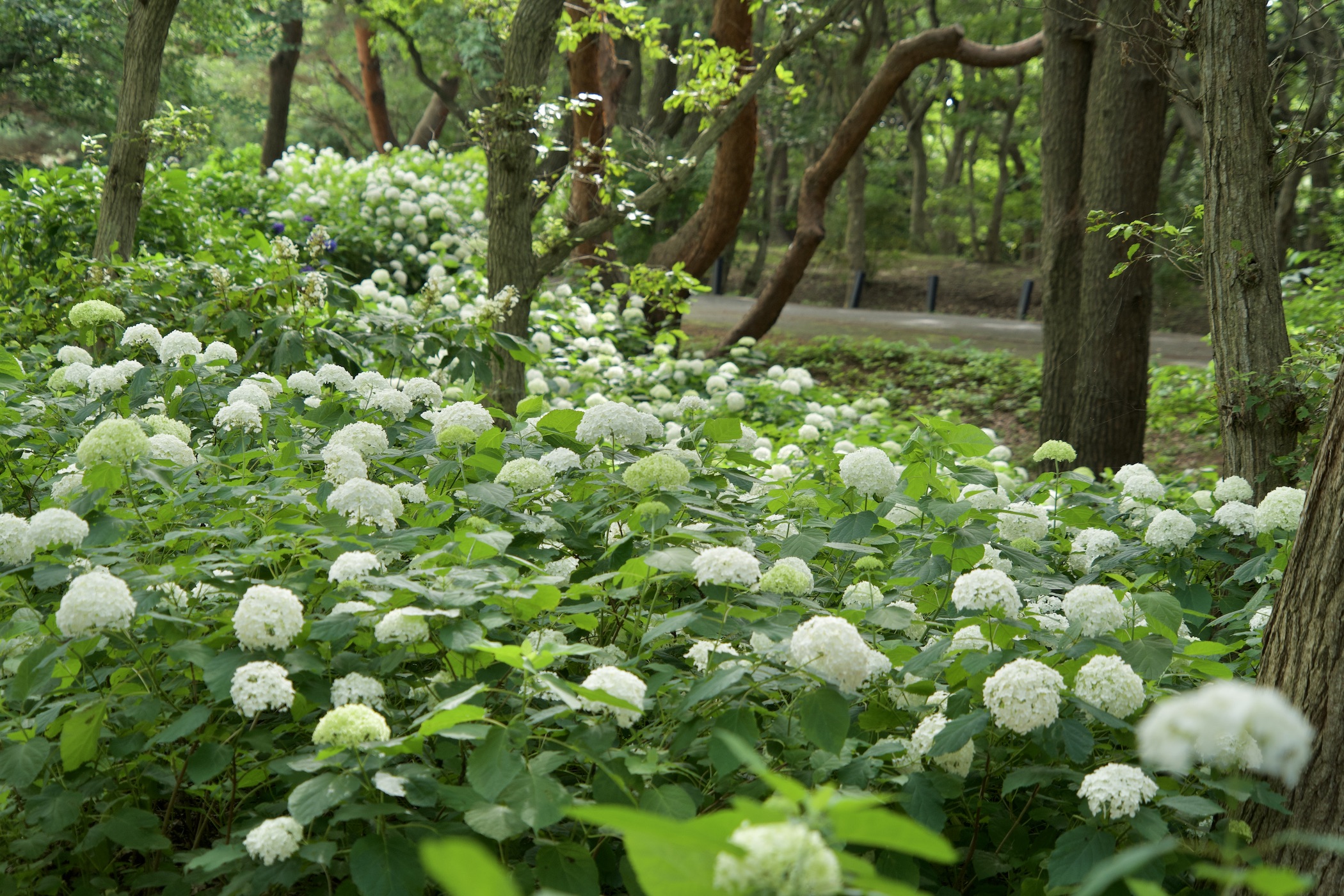 雨に濡れた葉は、緑がより鮮やかになり、白いアジサイをより一層引き立てます。また、天気が良い日には、木漏れ日が差し込む林内で、ゆらゆらと揺れる光が作り出す幻想的な風景をお楽しみいただけます。