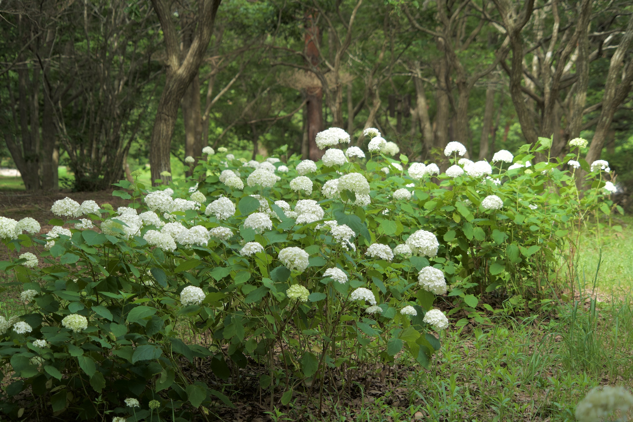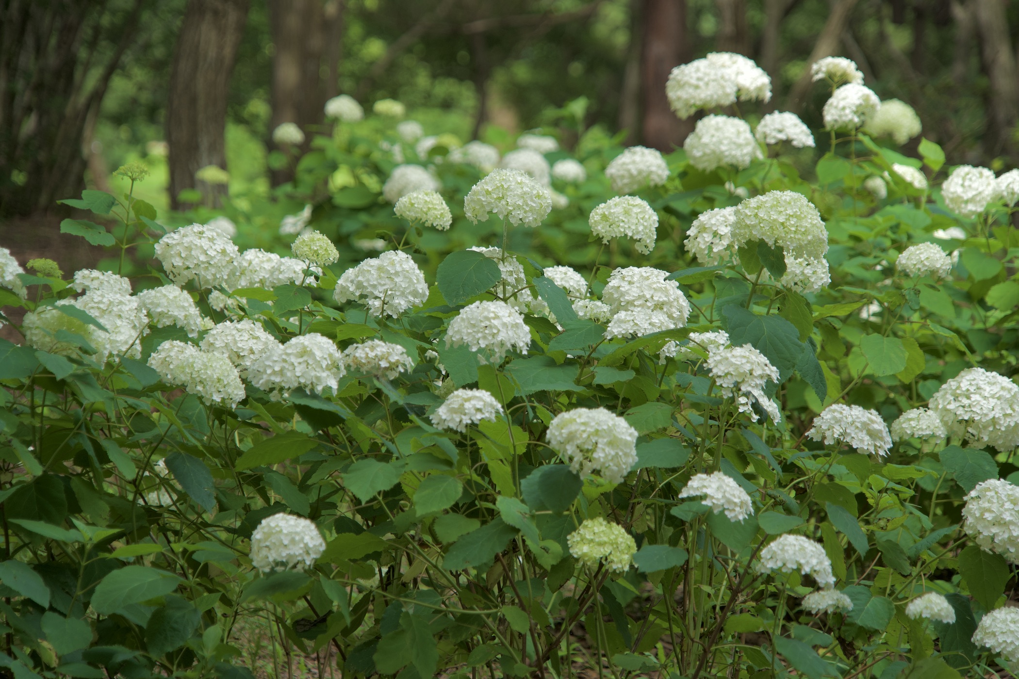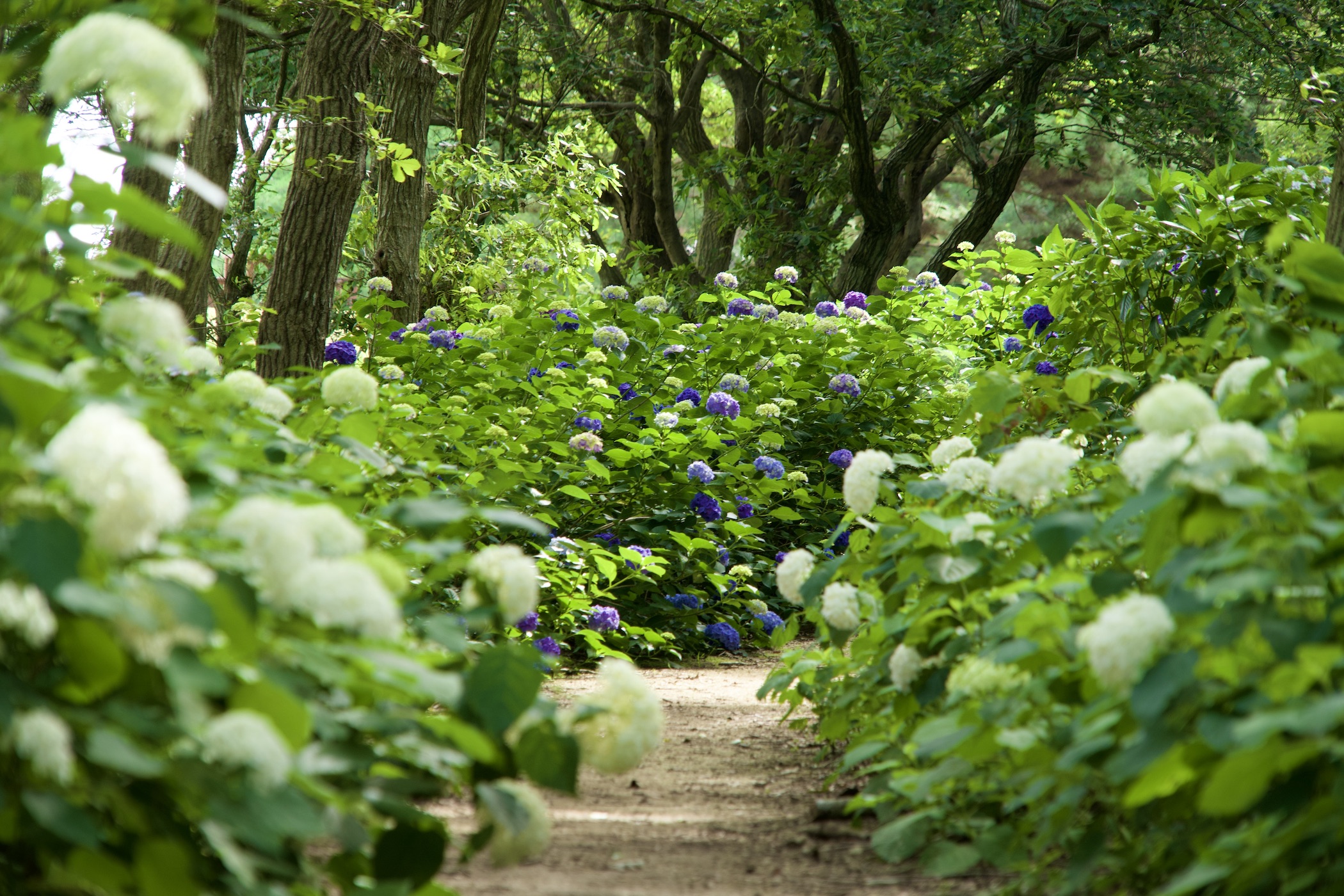 雨に濡れた葉は、緑がより鮮やかになり、白いアジサイをより一層引き立てます。また、天気が良い日には、木漏れ日が差し込む林内で、ゆらゆらと揺れる光が作り出す幻想的な風景をお楽しみいただけます。
