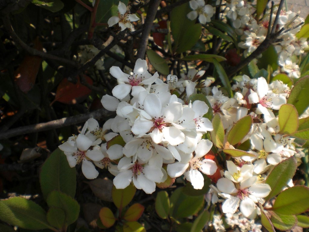 常緑の低木で、車輪状に枝を付けます。葉には光沢があり、枝先に小さな白い花が咲きます。