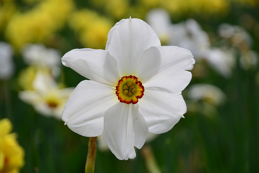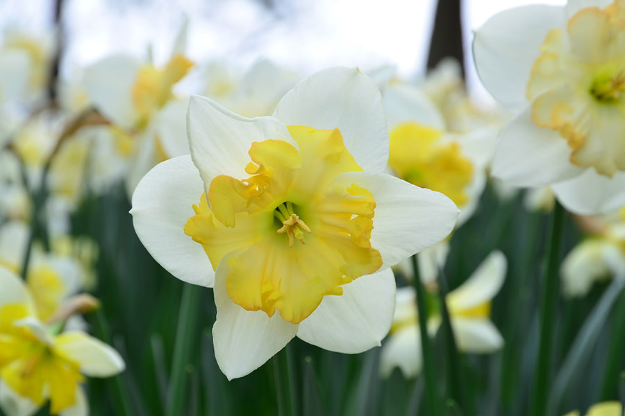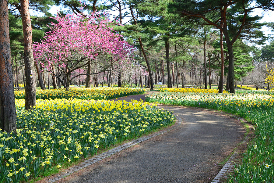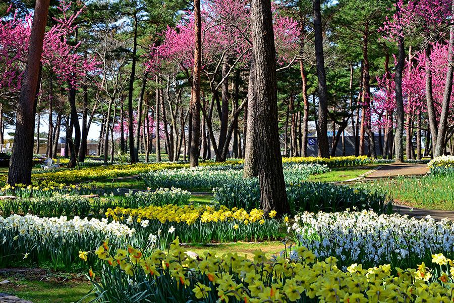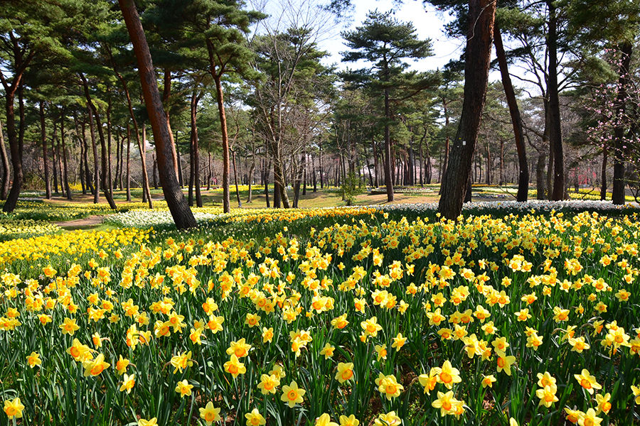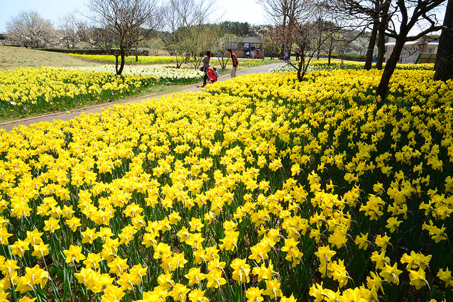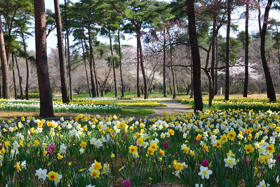 ひたち海浜公園の春はスイセンから。 ヒガンバナ科スイセン属 地中海沿岸原産で、主にイギリスで改良され、中国を経て日本へ渡来しました。 ひたち海浜公園のフラワーリレーは「スイセン」の開花から始まります。1ヘクタールのスイセンガーデンに咲く100万本のスイセンは、まるで松林の下に黄色い絨毯を敷き詰めたかのような美しさです。 鑑賞時期 3月下旬から4月中旬まで 場所 スイセンガーデン