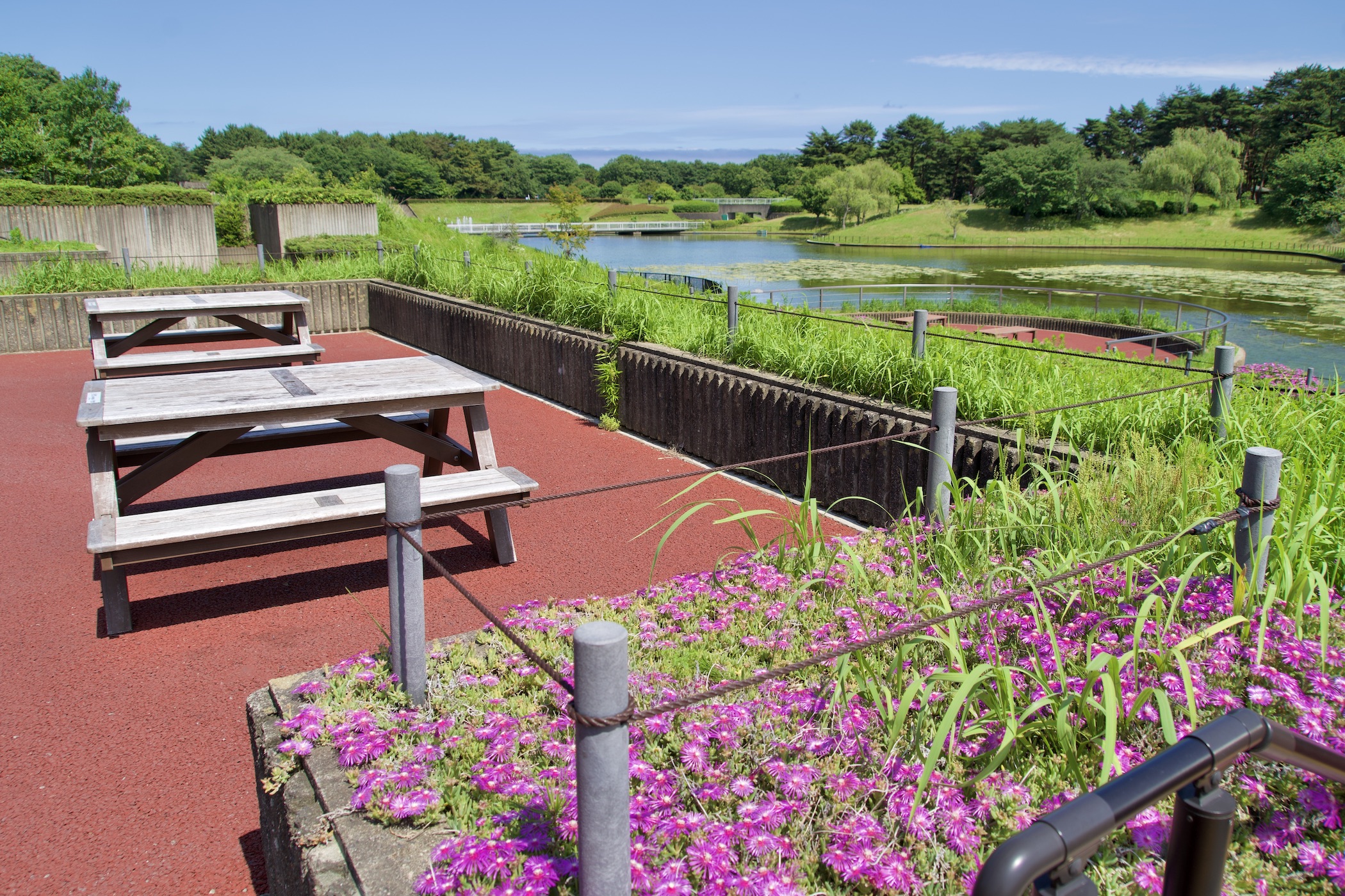 池や噴水を眺めながらブレイクタイム!水辺のテラス席が気持ちいいテイクアウト専門の軽食カフェ。お土産も扱う売店を併設。