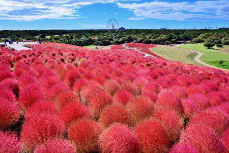 秋の国営ひたち海浜公園では、10月1日(土)から30日(日)まで「きて みて さわって コキアカーニバル」を開催中。緑、グラデーション、赤、そして黄金へと変化していく秋のコキア。季節の移ろいと共にコキアの色の変化を追いかけながら、お気に入りの色を探してみませんか?