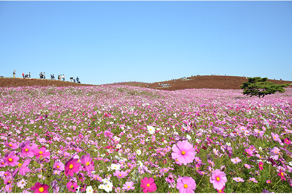 みはらしの丘のふもとでは白く可憐なソバの花や、赤・白・ピンクの美しいコスモスが咲き、コキアと共に色彩豊かな風景をつくり出します。その他にも⻩⾊やオレンジがまばゆいキバナコスモスや、白銀色のパンパスグラス、鮮やかなバラなどが秋の園内を彩ります。⽇々移ろいゆく秋の風景を、ぜひお楽しみください。