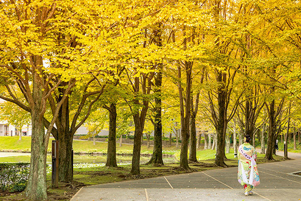 テラスガーデンを抜けると見えるカツラの並木。一見イチョウにも見えますが、葉をよく見てみると愛らしいハートの形をしています。そしてカツラの落ち葉からは、ほのかに甘いキャラメルのような香りがするのが特徴。この匂いは緑葉の時は少なく、黄葉、紅葉へと進むにつれて匂いがただようそうです。紅葉が楽しめるのは例年10月下旬頃まで。甘い香りに包まれながらカツラ並木の下で秋の訪れを感じてください。