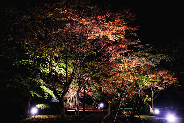 秋の偕楽園でおすすめのスポットは、紅葉の名所「もみじ谷」です。紅葉の見頃は11月中旬から。約170本のモミジ・カエデが赤く色づく風景は、まさに圧巻です。日中は爽やかな秋風の中、紅葉した葉っぱの間から覗く太陽の光がとても綺麗です。夜間にはライトアップを行っており、ライトに照らされた紅葉はとても幻想的で、昼間とひと味違った姿を見ることができます。