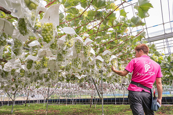 阿武隈山地の南端に位置する丘陵地で、カルシウムやミネラルを豊富に含んだ土壌の常陸太田市では、約60年前からブドウの生産が始まりました。甘くて美味しいブドウは、常陸太田市の代表的な特産品の一つです。そんなブドウを、先祖代々受け継がれた農園で栽培している武藤観光農園。現在は3代目、武藤翔平さんが日々美味しいブドウ栽培に勤しんでいます。