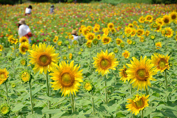 暑い夏こそ思いきり遊んで公園を満喫!ふわふわもこもこの緑色のコキアやカラフルなジニア、元気いっぱいなヒマワリなどの夏の花々がお出迎え。
