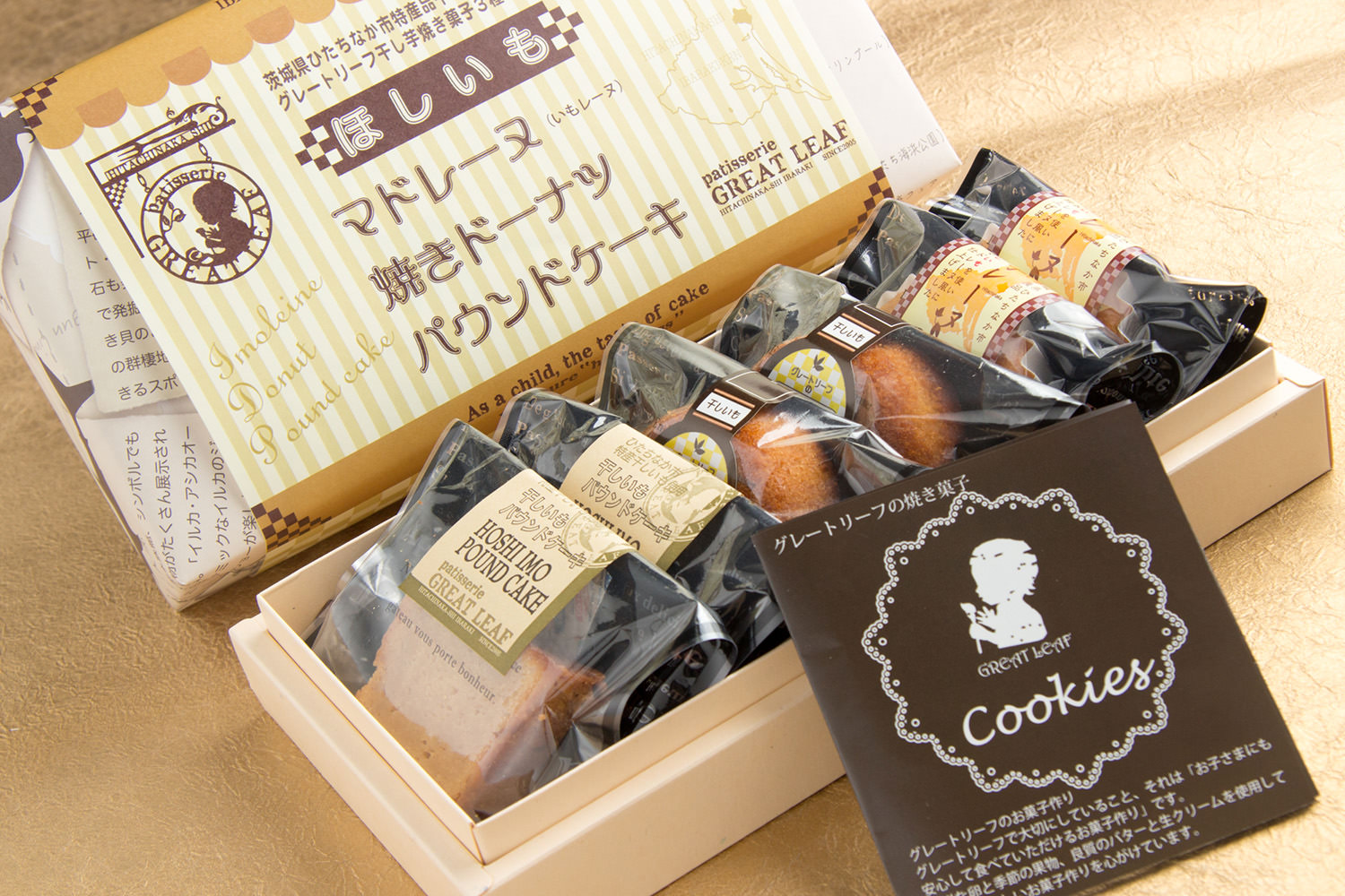 県外の方への手土産に出来る、地元のお菓子がほしい…そんなお客さんの声から誕生したのが、グレートリーフの「芋レーヌ」です。平干しいもを蒸してからペースト状にして生地へ練りこみ焼き上げたマドレーヌ。しっとり食感と、ほしいもの優しい甘さがマッチングした逸品です♪「ひたちなか」の焼印もポイント。他にも「干し芋ドーナッツ」「干し芋パウンド」をラインナップしています。使用しているほしいもにもこだわっており、すべて地元の生産者・城東フルーツさんと年間契約。その時期その時期の美味しいほしいもを使って、お菓子を焼き上げています。ほしいもスイーツ3種の詰め合わせも用意しているので、ぜひ食べ比べてみてください♪