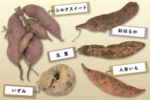 ほしいもはサツマイモが原材料。中でも、素朴なあまさと癖のない味わいで昔から愛されている品種は玉豊。他にもいずみや紅姫、特に甘味の強い紅はるかや上品な甘みのシルクスイートなど多くの品種がほしいもになります。
