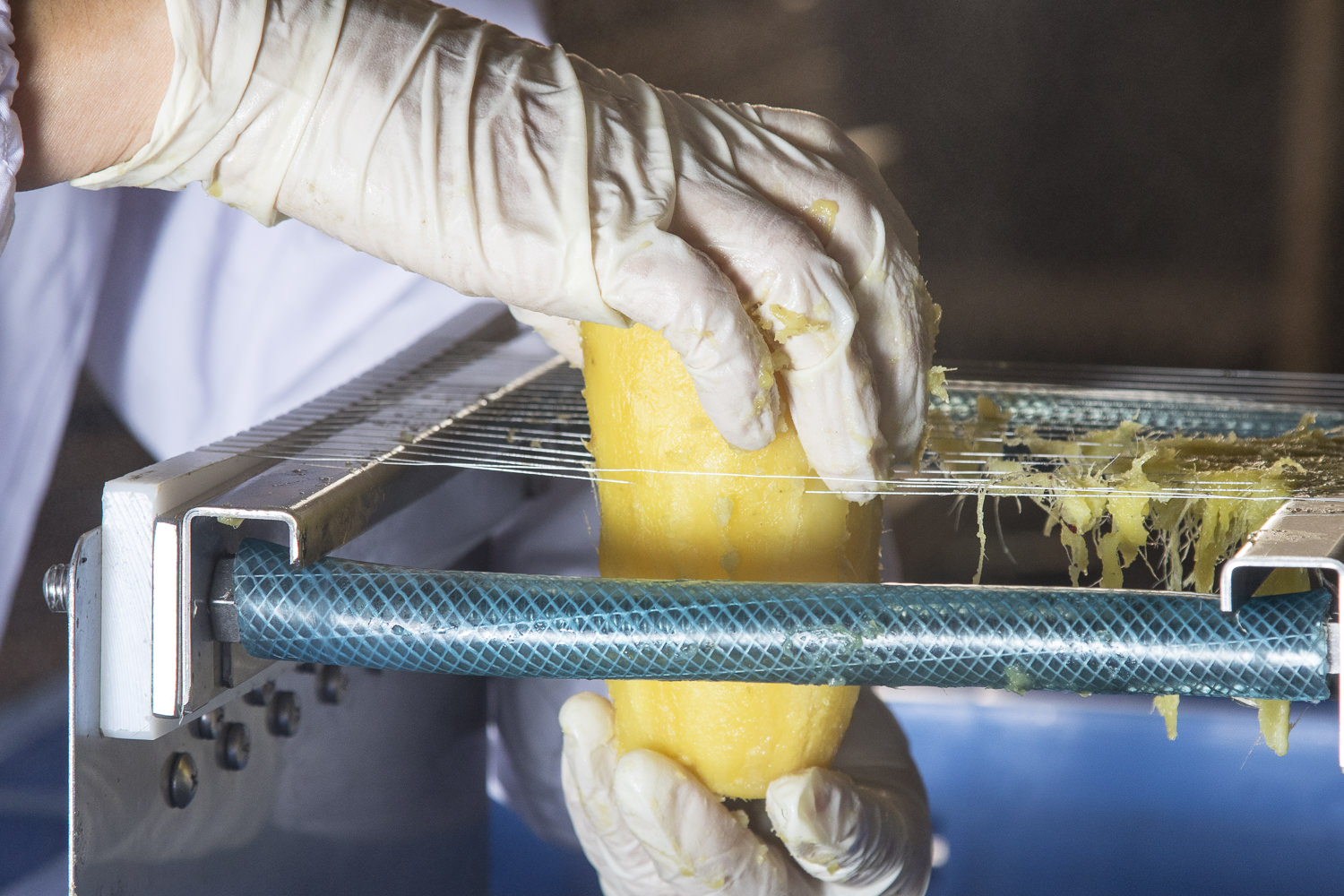 きれいに形を整えながら皮むきを行います。丸干しならば皮をむいてそのまま、平干しならピアノ線を張った専用スライサーで均一な厚さにカット。農家によって厚さが異なるので好みの厚さを探すのも干しいも選びの楽しさ。