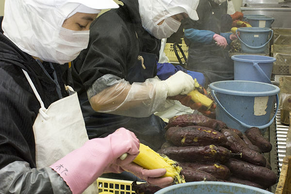 蒸かしたアツアツのサツマイモをひとつひとつ地元のお母さんたちが丁寧に手作業で皮むきしていきます。