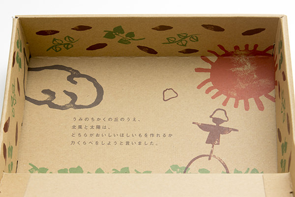 箱の裏側にもイソップ寓話『北風と太陽』をもじった物語が書いてあります♪