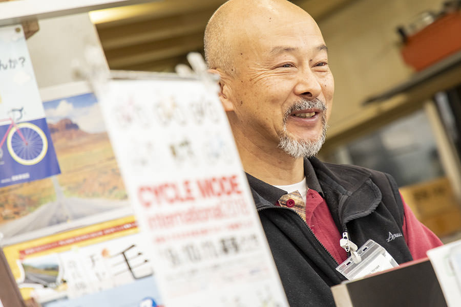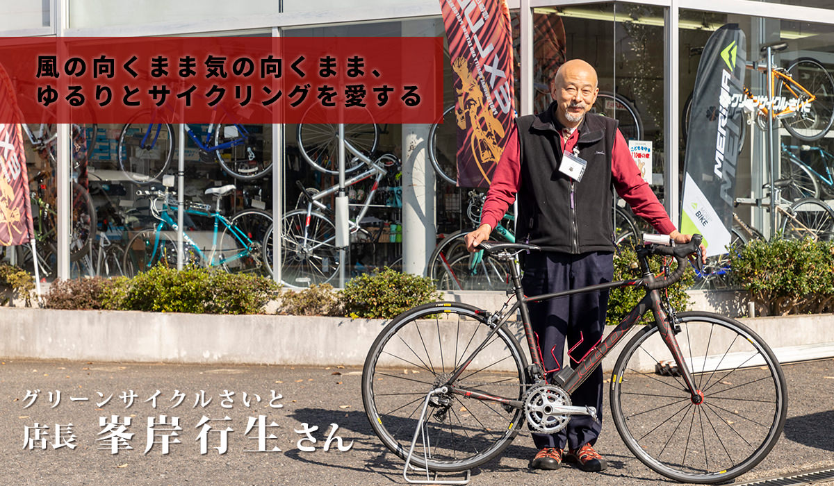 1962年茨城県生まれ、56歳。2008年に会社員から創業40年来の老舗サイクルショップ「グリーンサイクルさいと」に転職、現在同店の店長を務める。自身も子どもの頃から自転車を愛しており、愛車と共に全国各地を旅してきた。愛称は「峯ちゃん」。