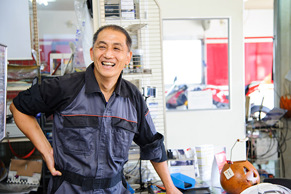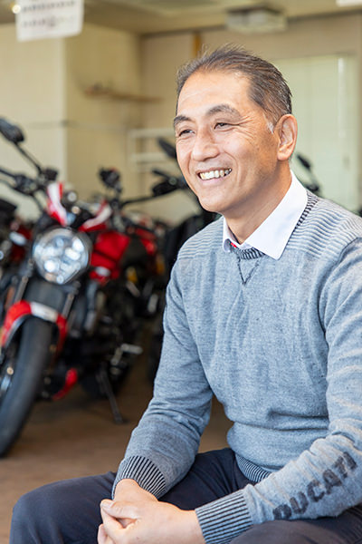 1966年生まれ、東京都出身。幼稚園のころ茨城県牛久市に引越し、以来茨城県で暮らす。学生時代から「バイク屋になりたい!」と志し、目標のためにバイクを知ろうとレースの道へ。国内バイクレース最高峰の全日本ロードレース選手権、鈴鹿8耐をはじめこれまで数多のレースを経験。1996年に念願のバイクショップを開業し、2009年にはイタリア製高級バイクメーカー「ドゥカティ」の県内唯一の正規ディーラーとなる。